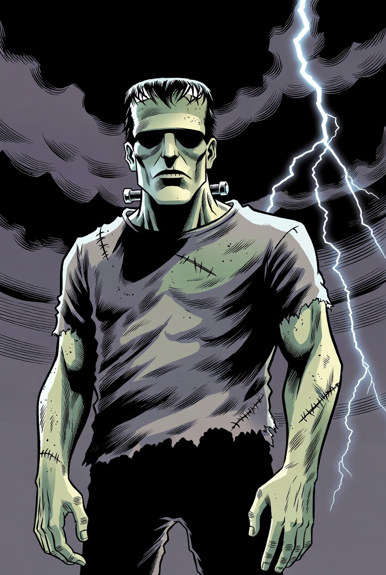 Frankenstein, Halloween, White, black pants, comic art, dark clouds, dramatic lighting, gothic, green skin, horror, illustration, lightning, male, monster, muscular arms, neck bolts, standing pose, stitches, storm, tattered shirt, thunder, Frankenstein monster