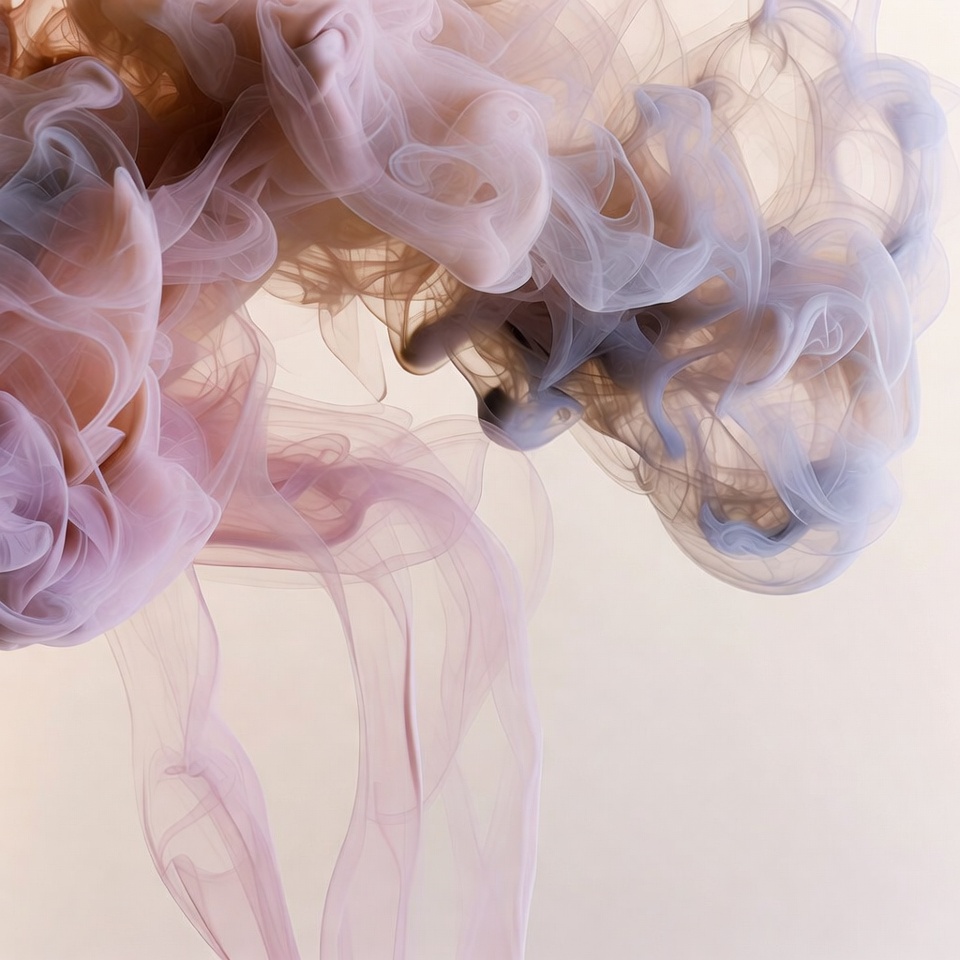 Swirling clouds of pink, purple, and blue smoke form intricate patterns against a plain white background. The smoke appears ethereal and fluid, captured in motion with soft gradients and wispy edges.