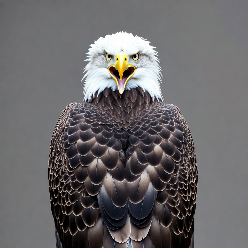 A majestic bald eagle faces forward with its beak open against a plain gray background. Its white head feathers contrast sharply with the dark brown body and wings. Bright yellow beak and piercing eyes are prominently featured.