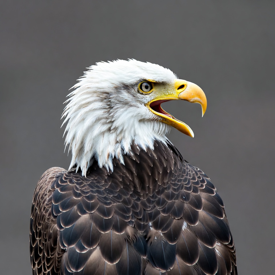A bald eagle faces forward with its beak wide open, revealing a bright yellow tongue and mouth. Its piercing yellow eyes stare intently, surrounded by thick white feathers on the head and neck. Dark brown feathers cover the body, set against a plain gray background.