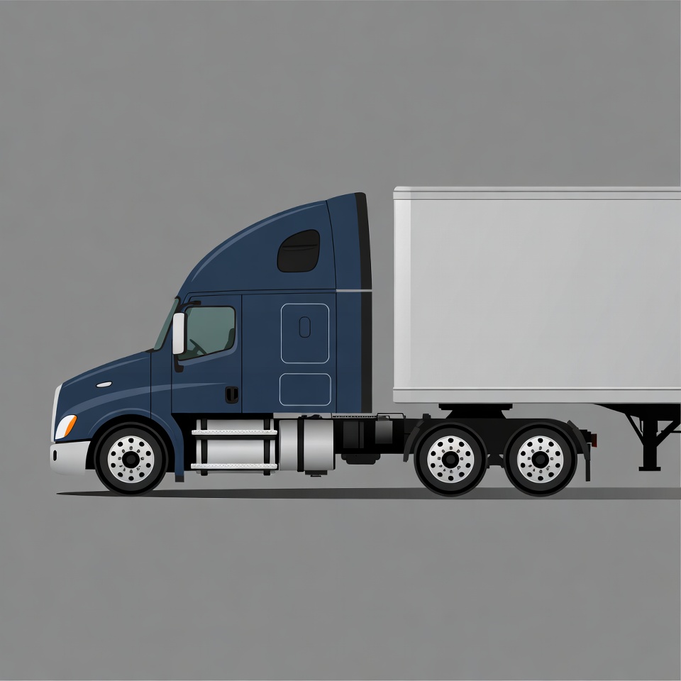 A vector illustration of a blue semi-truck with a white trailer on a gray background. The truck features a tall cab, large headlights, and dual rear wheels. It is depicted in a side view with clean, flat design elements.