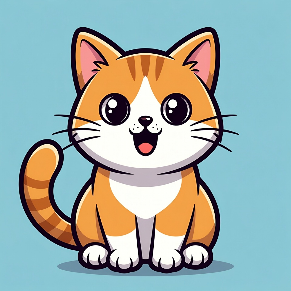 adorable, big eyes, blue background, cartoon cat, chibi cat, clipart, fun animal, happy face, illustration, isolated, kawaii, manga style, orange tabby, paws, pet illustration, smiling cat, striped tail, vector art, whiskers, white chest, cute kitten
