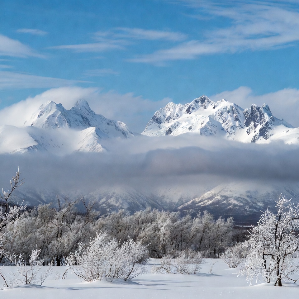 Majestic snow-capped mountains rise dramatically under a partly cloudy blue sky. Frost-covered trees stand in the snowy foreground, with mist partially obscuring the rugged peaks. The scene features a vast winter landscape with fresh snow blanketing the ground.