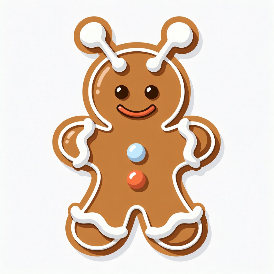 A cute cartoon gingerbread man with white antennae stands on a white background. It has big eyes, a smiling mouth, and colorful buttons on its brown icing-covered body. White icing outlines its arms, legs, and gingerbread shape.