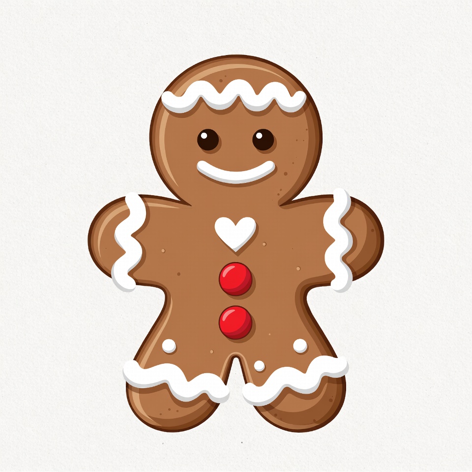 Christmas, brown cookie, candy buttons, cartoon, clipart, cookie, cute, festive, gingerbread, heart decoration, holiday, icing, illustration, isolated background, smiling, white background, gingerbread man