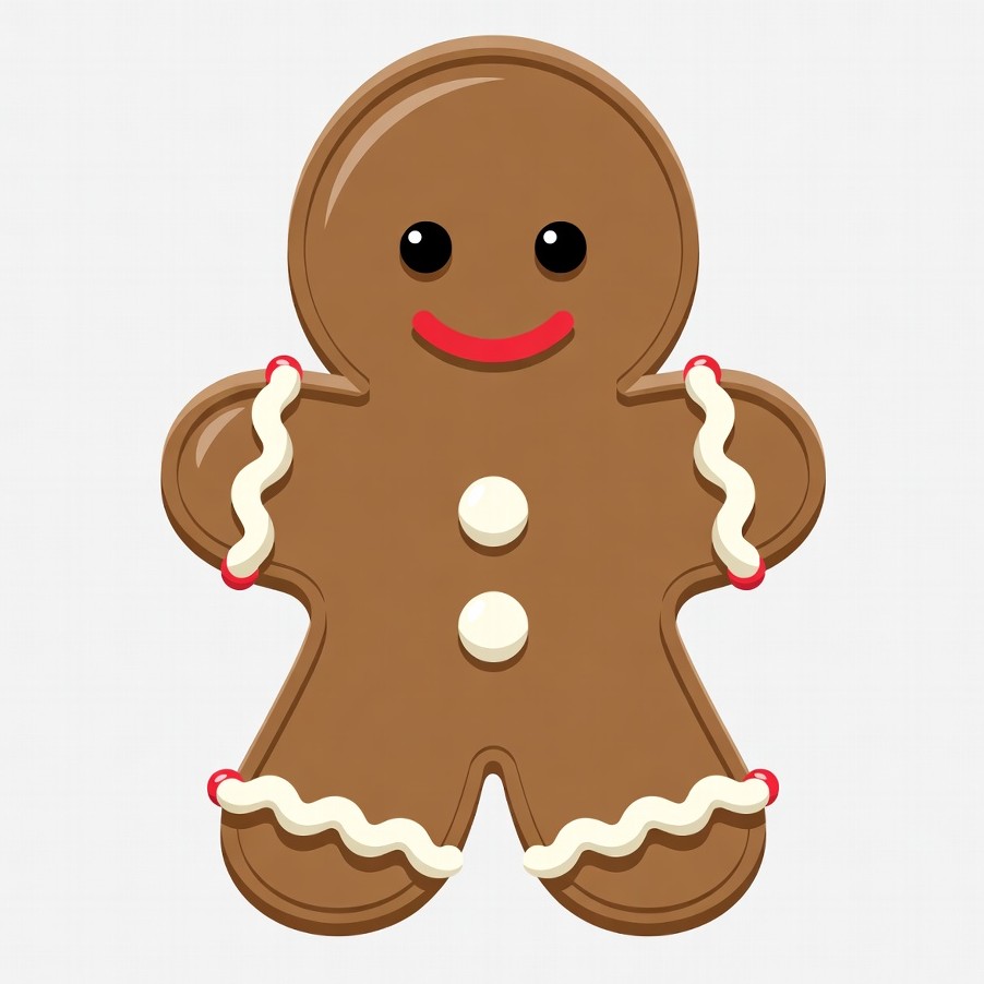 A cheerful cartoon gingerbread man stands on a white background. It features a brown gingerbread body with white icing outlines and red candy buttons. The figure has big black eyes, a smiling red mouth, and icing trim on the arms and legs.