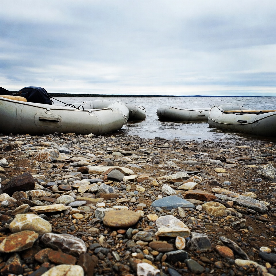 beach, boats, calm water, cloudy sky, gravel, gray rafts, inflatable rafts, lake, nature, outdoor, pebbles, rocky beach, shore, shoreline, stones, water, wilderness, rafts
