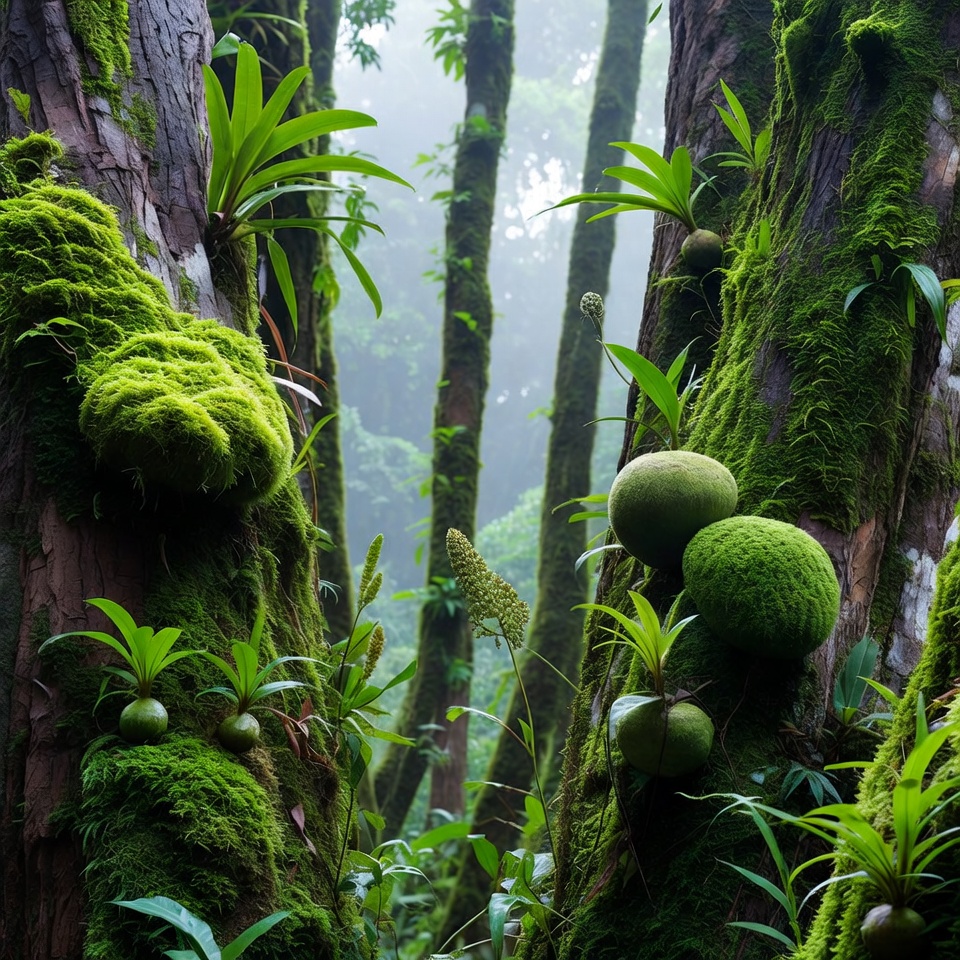Tall trees covered in thick green moss and ferns stand in a misty rainforest. Lush vegetation including broad leaves, moss balls, and epiphytes clings to the rough bark. Fog filters through the dense canopy, creating a layered forest scene.