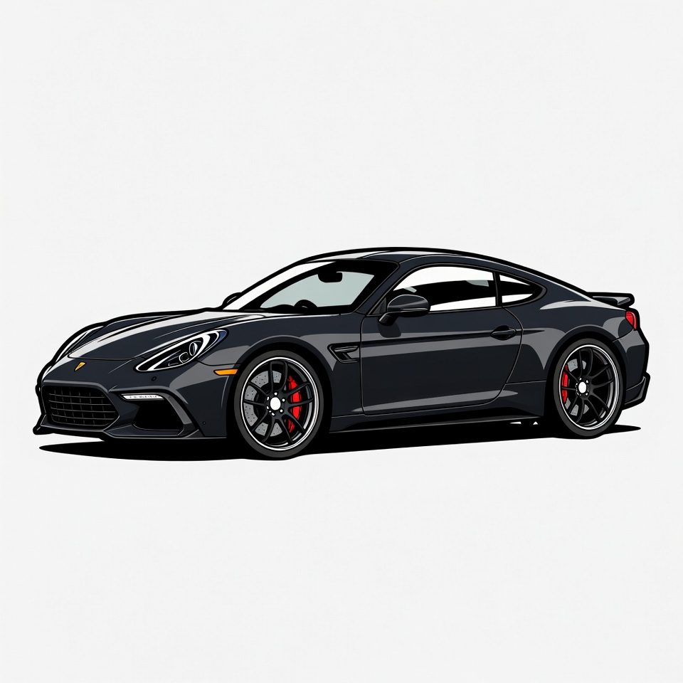 A detailed vector illustration of a sleek black Porsche 911 GT3 RS sports car on a white background. The car features a low-slung coupe body with aerodynamic curves, large black alloy wheels with red brake calipers, and prominent front air intakes. It is depicted in a side-front angle with glossy black paint and subtle highlights.