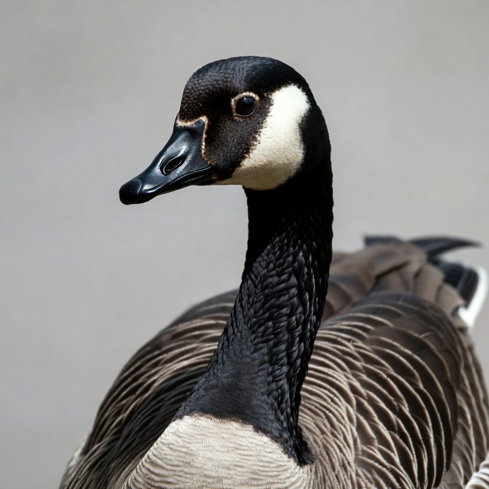 A Canada goose faces the camera with its distinctive black head and white cheek patch. Its orange beak is prominent, and its neck feathers show detailed texture. The bird is set against a plain gray background.