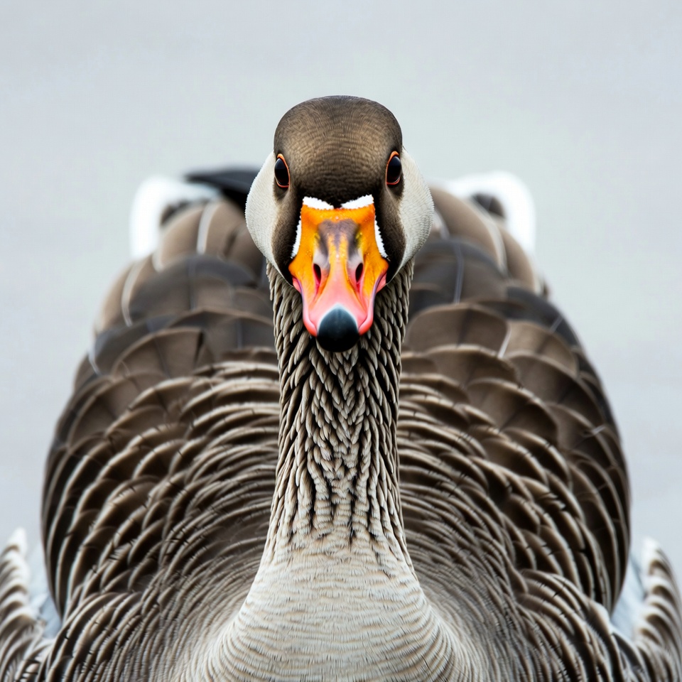 A greylag goose faces the camera directly with its detailed brown head and bright orange bill prominently featured. White stripes outline its eyes and neck against the gray feathers. The bird is centered on a plain light gray background.
