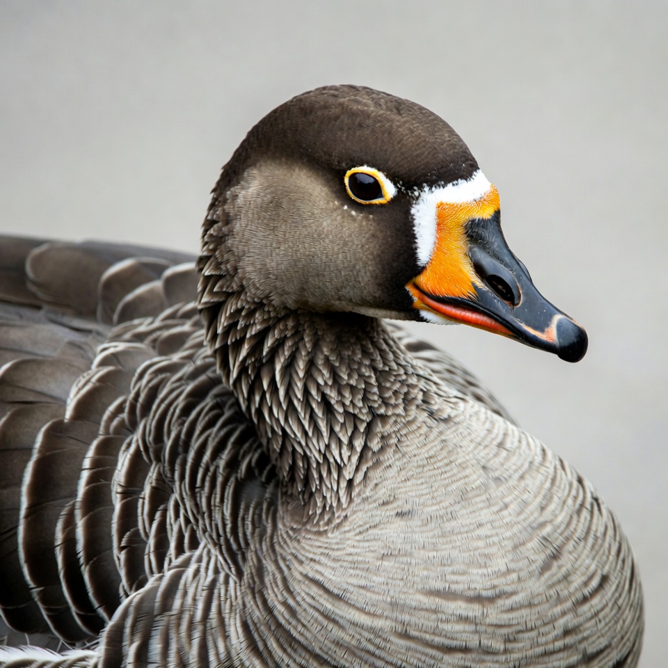 A detailed close-up of an Egyptian goose's head and neck against a plain gray background. The goose features brown feathers, a striking white eye patch bordered by orange, and a black-tipped orange bill. Its large yellow eye is prominently visible.