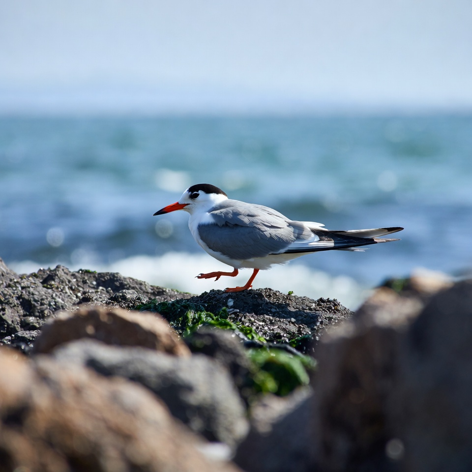 beach rocks, bird, black cap, gray wings, isolated background, nature, ocean waves, orange bill, orange legs, rocky shore, sea, seabird, seaweed, shorebird, tern, wading bird, white bird, wildlife, gull-billed tern