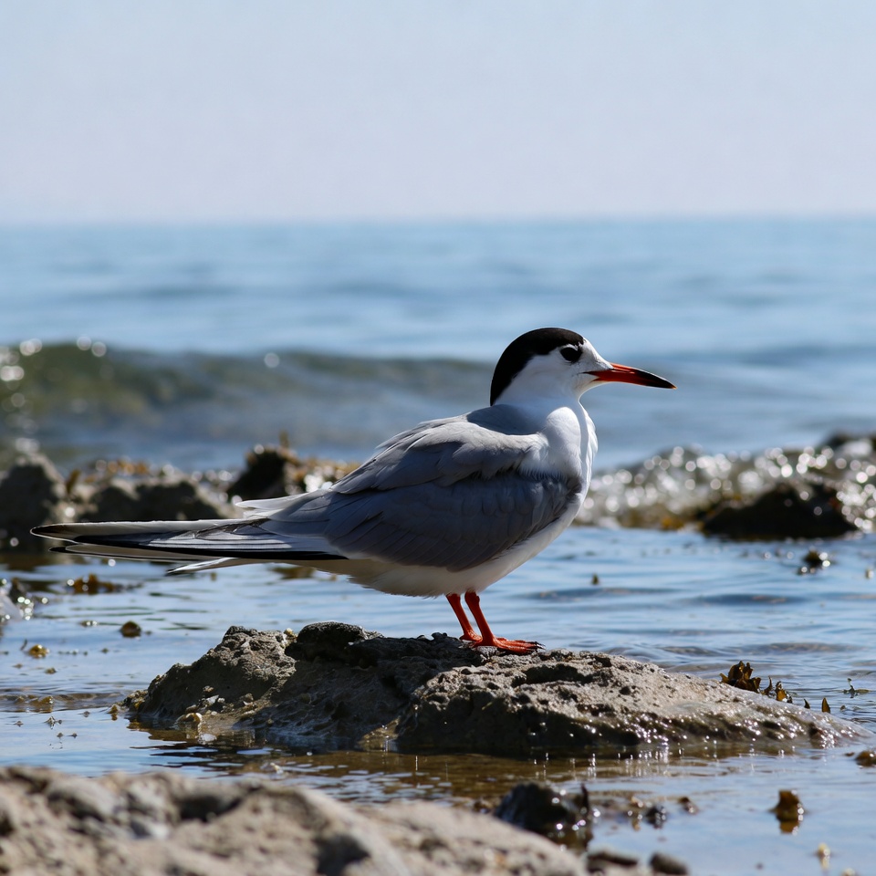 A white and gray gull with a black cap and red beak stands on a rock near shallow ocean waves. Its wings are slightly folded, and it faces the clear blue water with gentle waves lapping around the rocks. The background shows a bright blue sky.