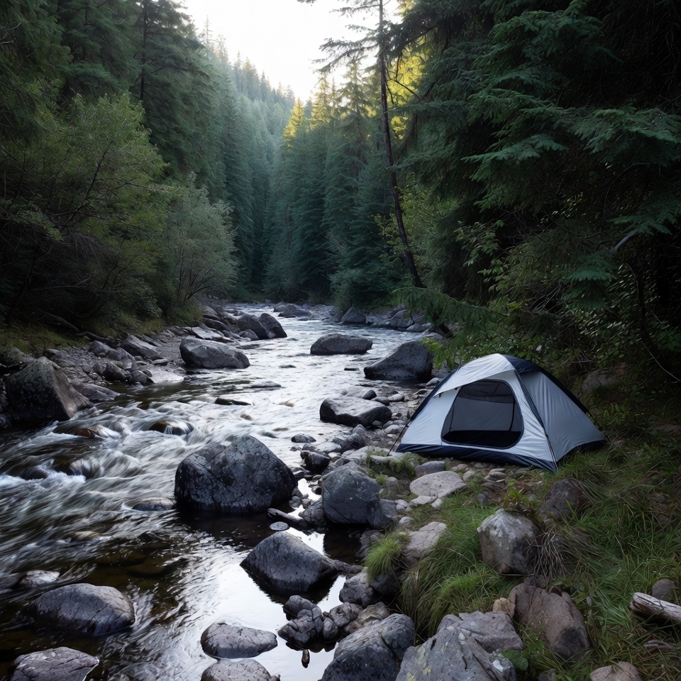 A green dome tent is pitched on a rocky riverside surrounded by dense evergreen forest. The clear river flows gently over smooth stones beside the tent. Sunlight filters through the tall trees, illuminating the scenic campsite.