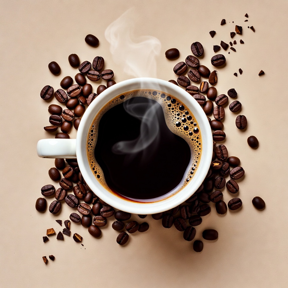 beverage, black coffee, caffeine, coffee aroma, coffee beans, coffee cup, fresh brew, hot coffee, isolated background, morning drink, roasted beans, steam, steaming coffee, white cup, coffee