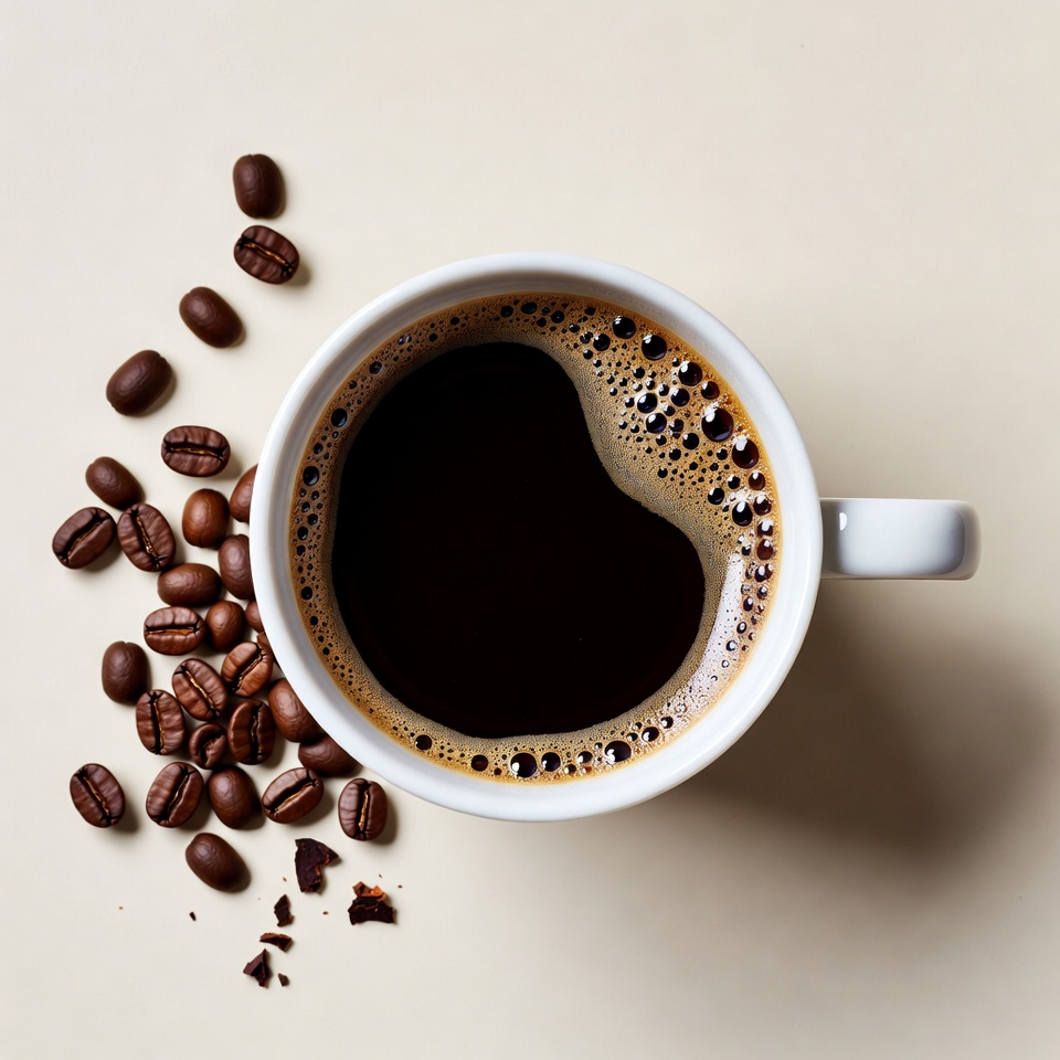 beverage, black coffee, caffeine, coffee beans, coffee foam, espresso, hot drink, isolated background, morning coffee, overhead shot, roasted beans, steaming coffee, top view, white cup, coffee cup