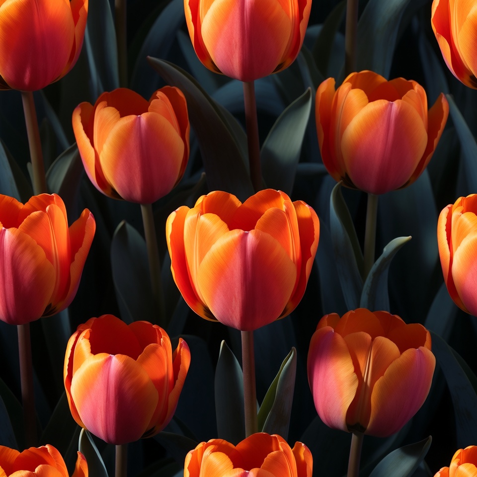 A dense cluster of vibrant orange tulips stands tall against a dark green and black background. The flowers feature cupped petals in shades of orange and pink with slender green stems and leaves. The arrangement creates a seamless, repeating pattern ideal for backgrounds.