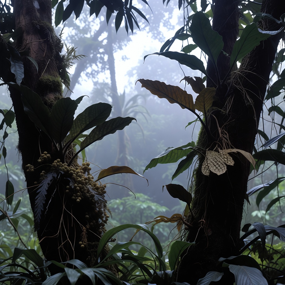 berries, canopy, dense vegetation, epiphytes, ferns, fog, foggy woods, foliage, green leaves, humid forest, jungle scene, lush greenery, mist, misty jungle, mossy trees, nature, orchids, rainforest plants, tall trees, tropical forest, tropical plants, undergrowth, vines, wilderness, rainforest