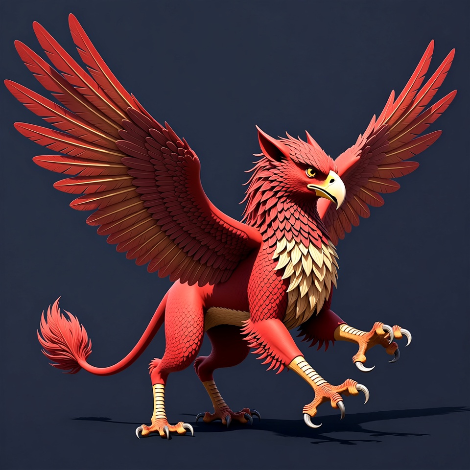 3D illustration, claws, dark background, digital art, eagle head, fantasy animal, feathers, fierce griffin, gold feathers, isolated background, lion body, majestic beast, mythical creature, red griffin, spread wings, wings spread, yellow beak, griffin