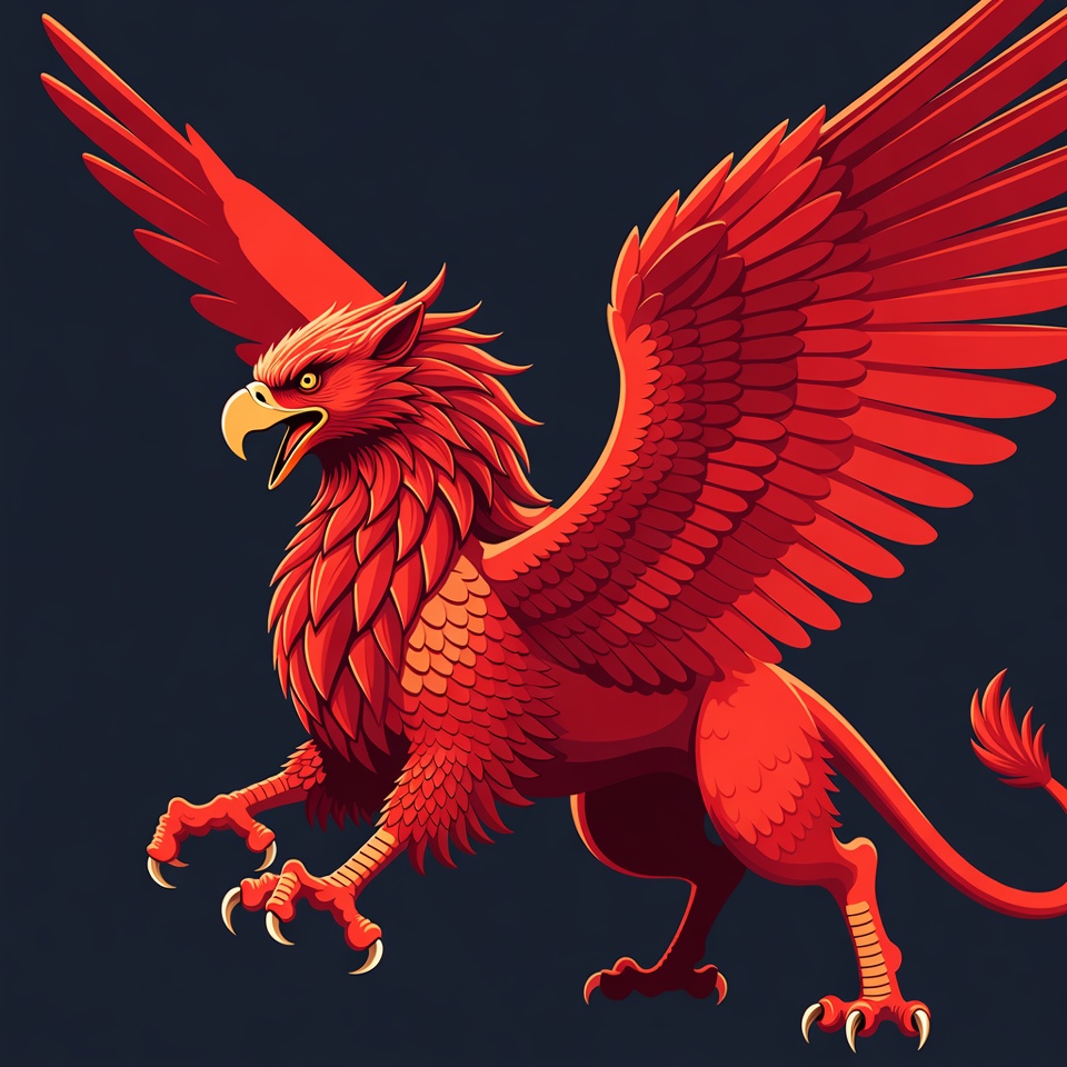 A vibrant red griffin with eagle head and lion body stands on its hind legs against a dark background. Its massive wings are spread wide, and it roars fiercely with sharp talons extended. The detailed feathers and fur are rendered in a bold vector illustration style.