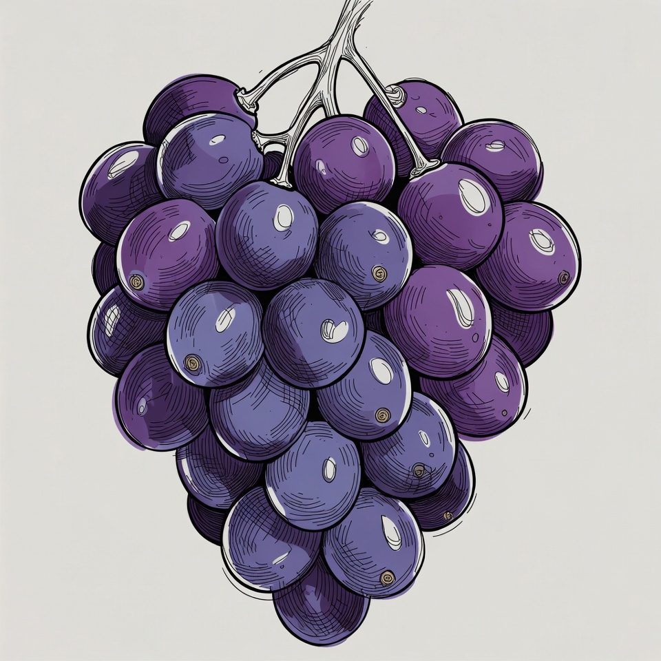 A detailed illustration of a bunch of ripe purple grapes hanging from a stem. The grapes are depicted in various shades of purple with white highlights and fine line art details. The bunch is centered against a plain white background.
