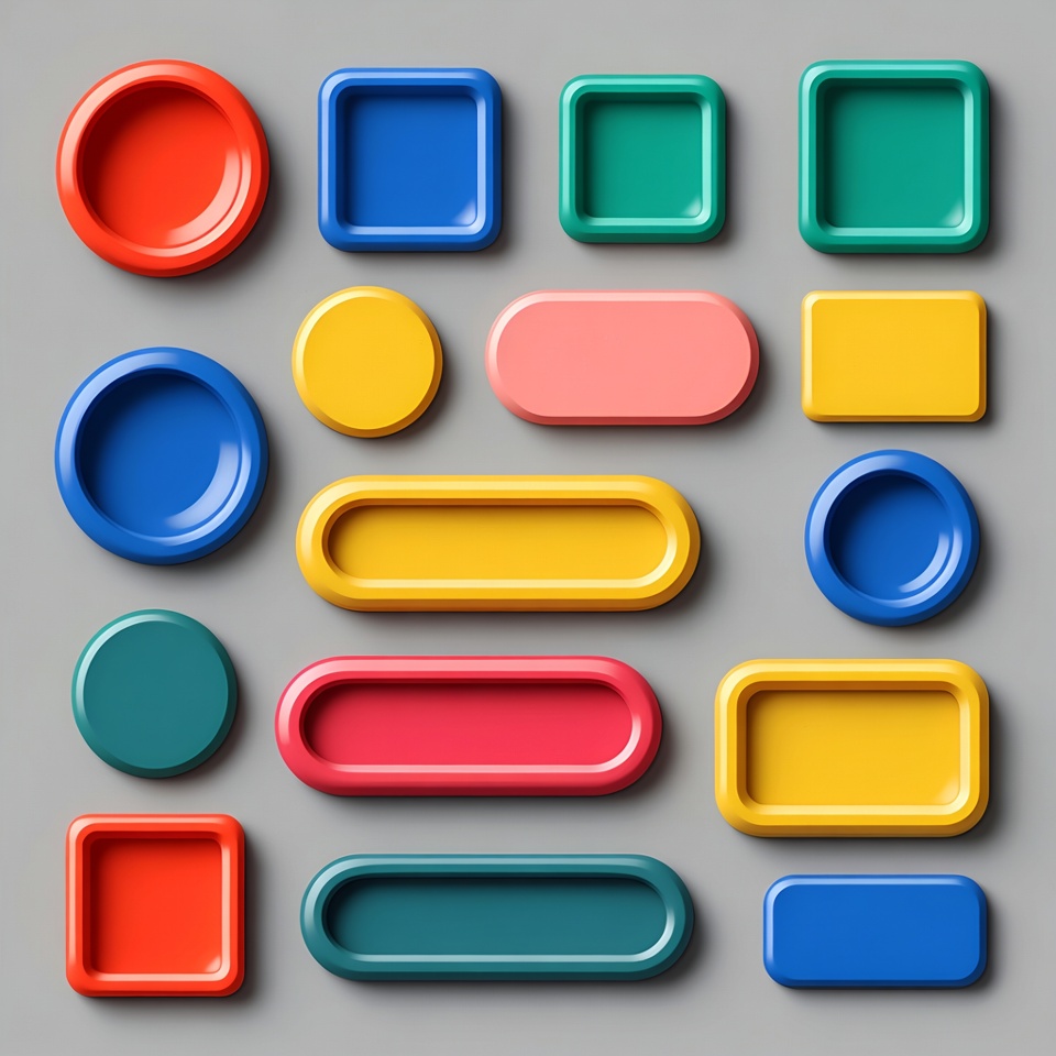 3D shapes, UI elements, abstract art, blue shapes, bright colors, circles, clipart, colorful shapes, design assets, gray background, green shapes, isolated background, modern design, ovals, pink shapes, plastic shapes, rectangles, red shapes, rounded edges, shape collection, squares, vector shapes, vibrant colors, yellow shapes, geometric shapes