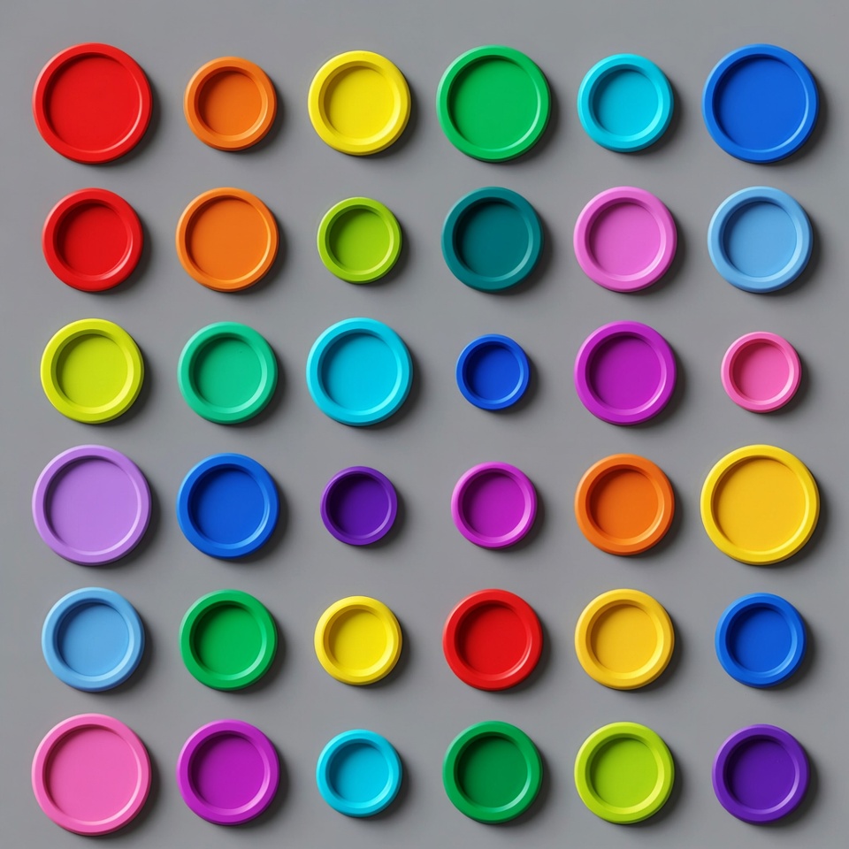arranged circles, blue circle, bright colors, circular objects, color grid, color palette, flat lay, glossy circles, gray background, green circle, isolated background, multi-colored, orange circle, pink circle, plastic discs, purple circle, rainbow colors, red circle, round shapes, top view, toy discs, vibrant colors, yellow circle, colorful circles