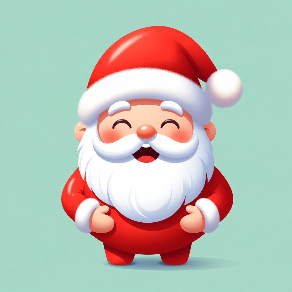 A cute chibi-style Santa Claus with a red hat, white beard, and rosy cheeks stands on a light green background. He wears a red suit with white trim and holds his hands to his chest in a cheerful pose. His big smiling mouth and squinted eyes convey joy in this digital illustration.