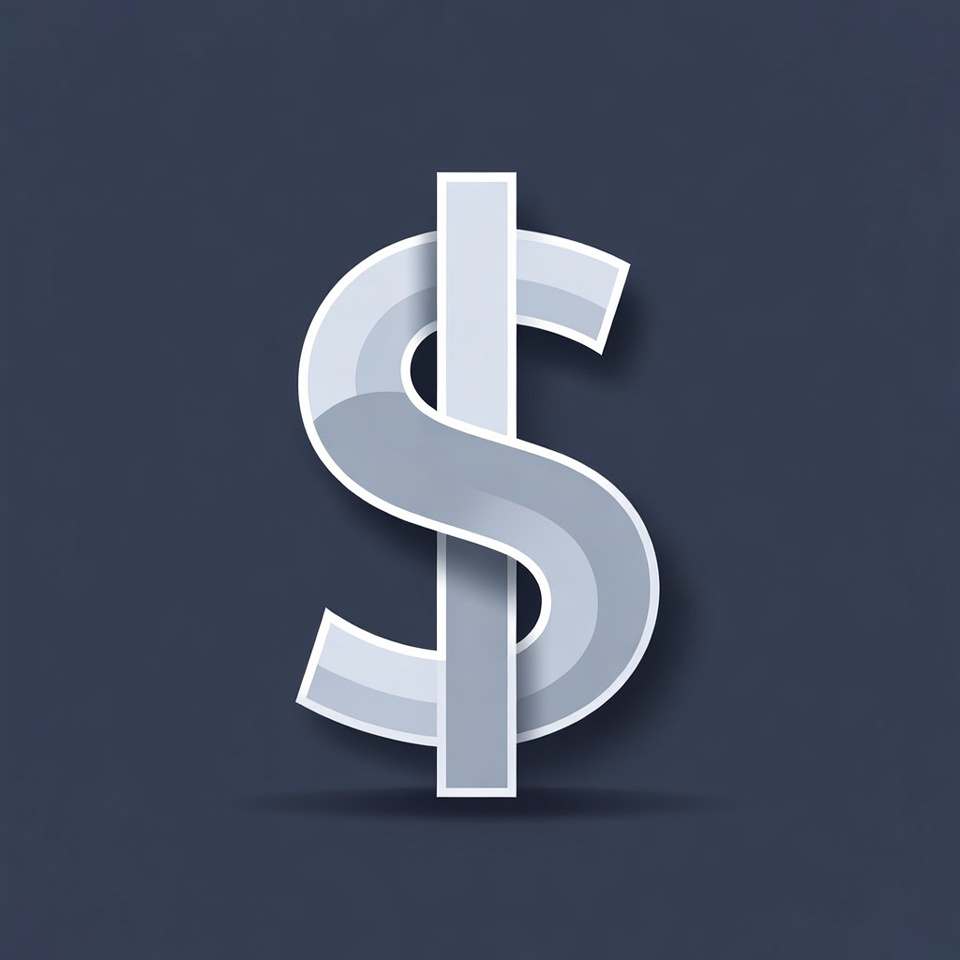 A glossy silver dollar sign symbol with subtle gradients and shadows floats against a dark navy blue background. The design features a thick vertical bar and elegant S-shaped curves. It has a modern, metallic appearance with a slight 3D effect.