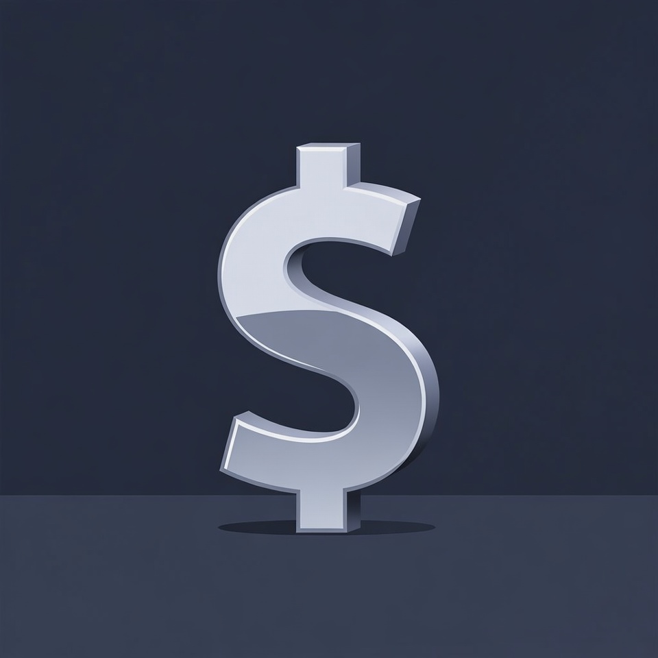 A 3D silver dollar sign symbol stands on a dark blue background. The top half is solid metallic silver, while the bottom half is filled with transparent liquid. It features a subtle shadow beneath for a realistic 3D effect.