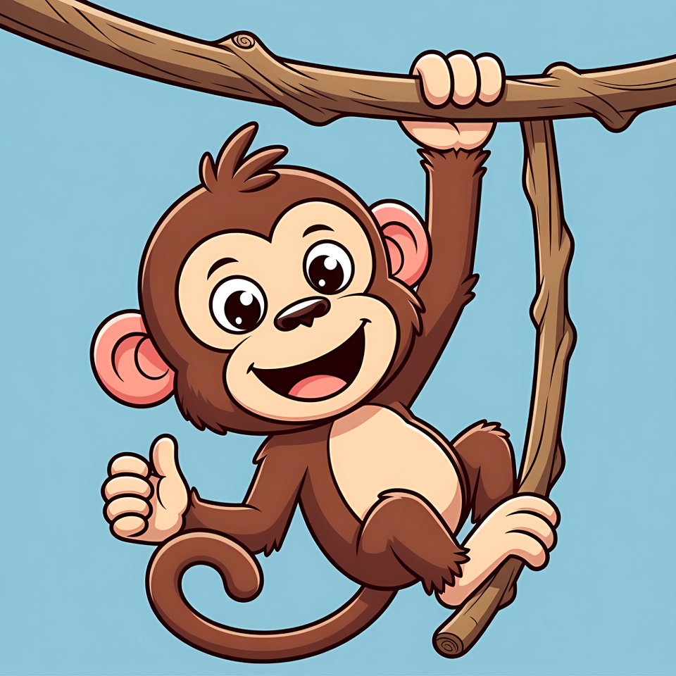 animal, big eyes, blue background, brown monkey, cartoon monkey, clipart, curly tail, cute monkey, hanging monkey, illustration, isolated background, monkey on branch, smiling monkey, thumbs up, wooden branch, monkey