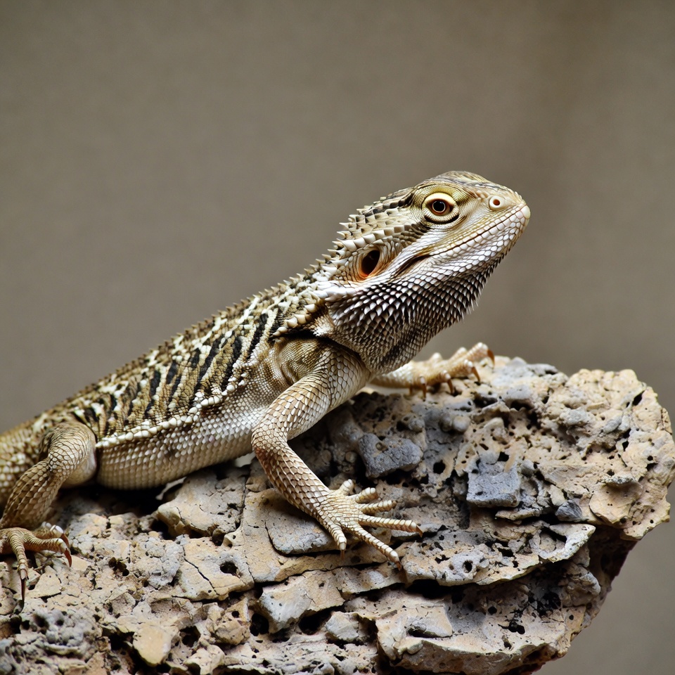 A bearded dragon lizard sits on a textured rock surface. It has a spiky beard under its chin, golden eyes, and intricate brown and tan scales with stripes. The background is a neutral gray.