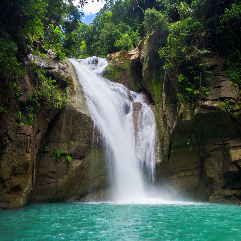 A tall waterfall cascades down moss-covered rocks into a vibrant turquoise pool. Lush green tropical vegetation surrounds the rocky cliffs and water. The scene features clear flowing water and dense jungle foliage.