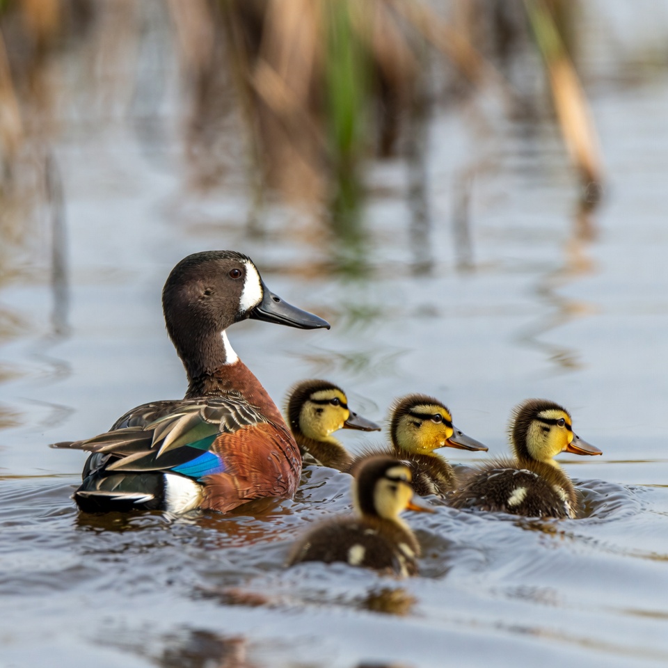 baby ducks, bird photography, birds, blue wings, chestnut feathers, duck family, ducklings, male duck, nature, reeds, shallow water, swimming ducks, waterfowl, wetlands, white face, wildlife, yellow ducklings, cinnamon teal