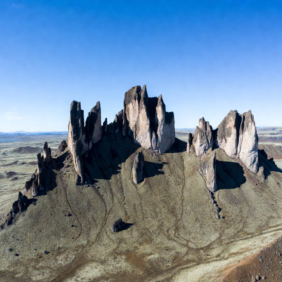 Aerial view of tall, jagged rock spires rising from a vast desert plain under a clear blue sky. The formations feature sharp peaks and eroded surfaces in shades of brown and gray. The surrounding terrain is arid with subtle green patches and distant horizons.