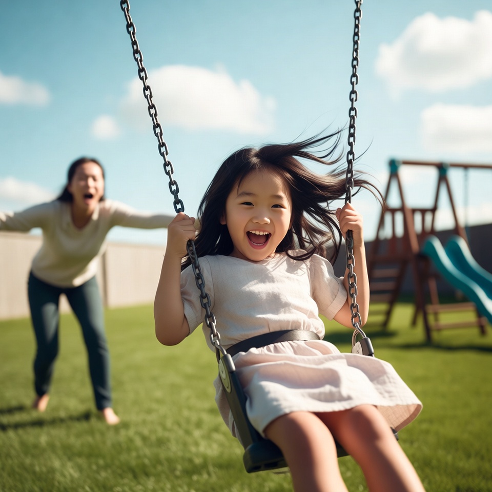 A young Asian girl with long dark hair swings high on a playground swing, smiling widely with wind blowing her hair. Her Asian mother stands behind pushing the swing in a grassy backyard with a wooden playset and blue slide nearby. Both wear casual light-colored clothing under a clear blue sky.