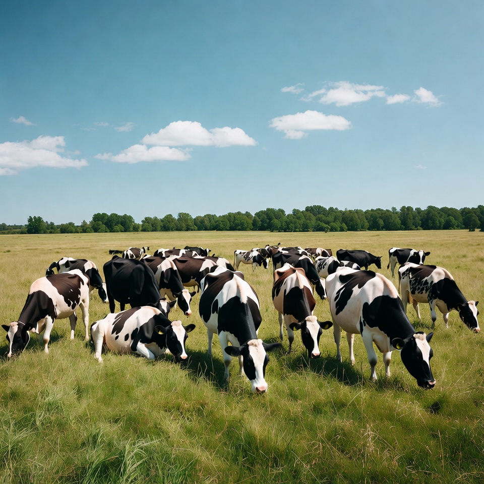 A large herd of black and white Holstein cows grazes on lush green grass in an open field. They stand and eat under a clear blue sky with scattered white clouds. A tree line borders the field in the background.