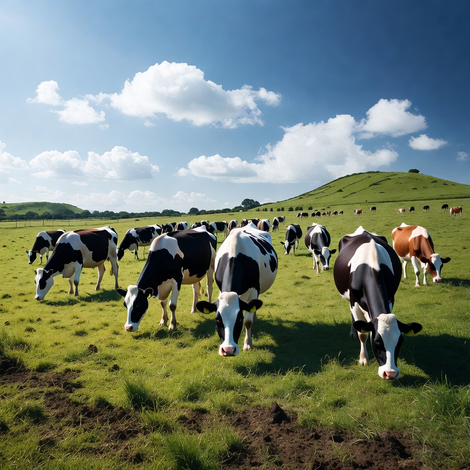 A herd of black and white Holstein cows grazes on lush green grass under a bright blue sky with scattered white clouds. Several cows with distinctive spotted patterns stand and eat in the foreground, while others are scattered across the rolling hillside in the background. The vibrant green pasture and distant hills create a serene pastoral scene.