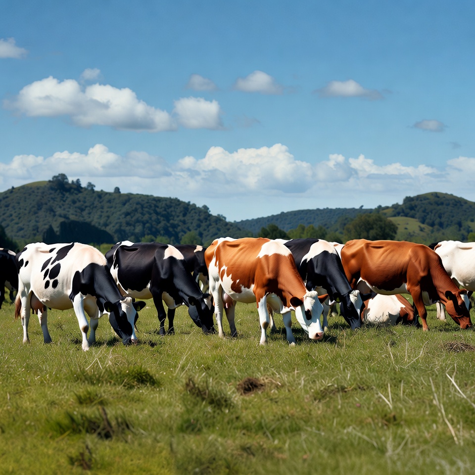 A herd of black and white Holstein cows and brown cows grazes on lush green grass in a sunny field. They stand close together with some bending down to eat. In the background, rolling green hills rise under a blue sky with scattered white clouds.
