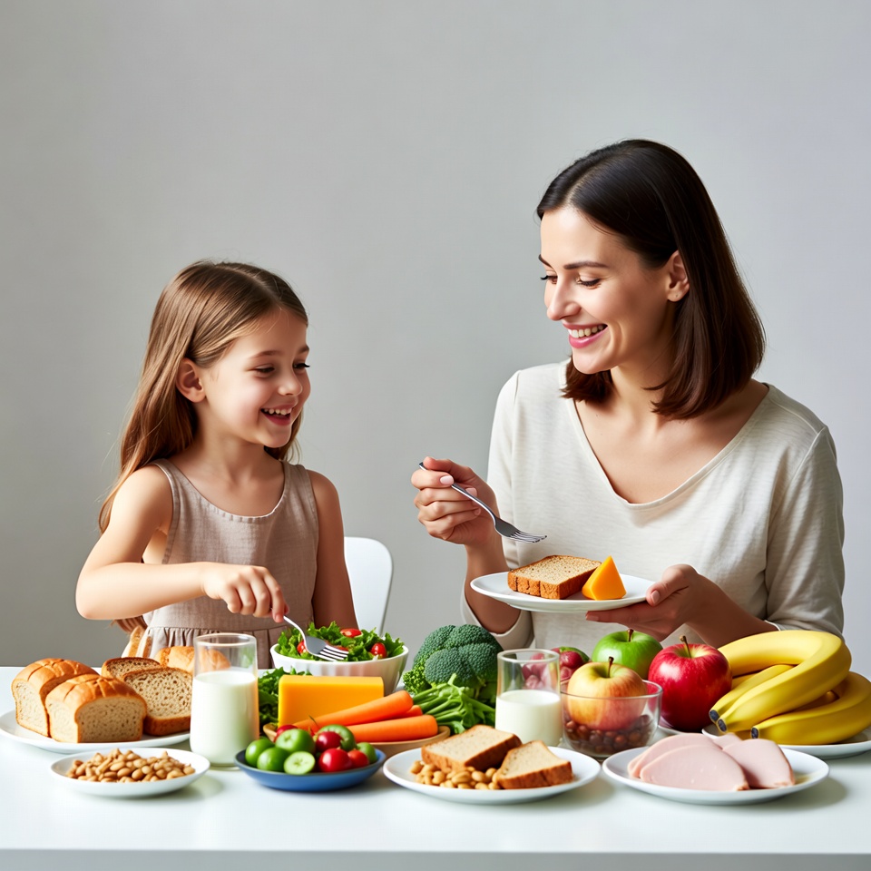 A smiling mother and young daughter sit at a white table enjoying a nutritious meal together. The table is filled with fresh fruits like apples, bananas, and grapes, vegetables such as broccoli, carrots, and salad, along with bread, cheese, ham, milk, and yogurt. The mother holds a plate with bread and melon while feeding her daughter, both dressed in casual light-colored clothing against a plain background.