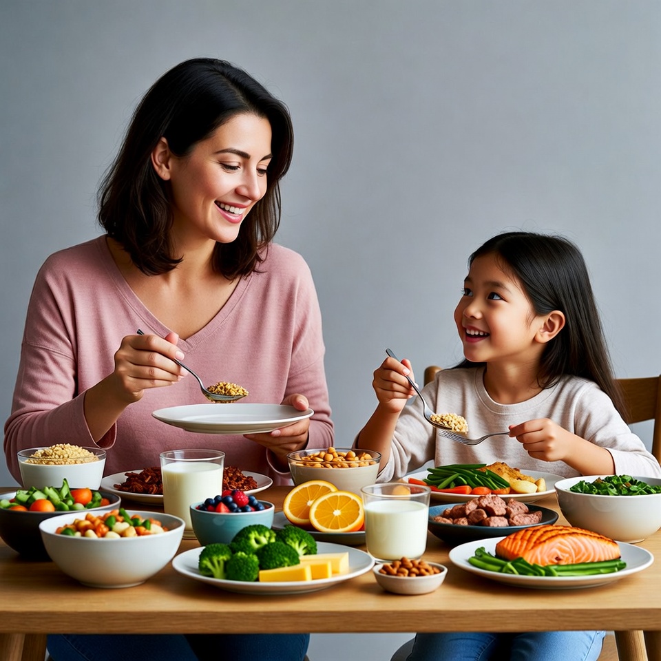 A smiling mother with dark hair in a pink sweater and her young Asian daughter in a light top sit at a wooden table enjoying a nutritious breakfast. They hold spoons with cereal as they share a joyful meal. The table is filled with bowls of fruits like oranges and berries, vegetables such as broccoli and green beans, salmon, rice, milk, yogurt, and nuts on a plain gray background.