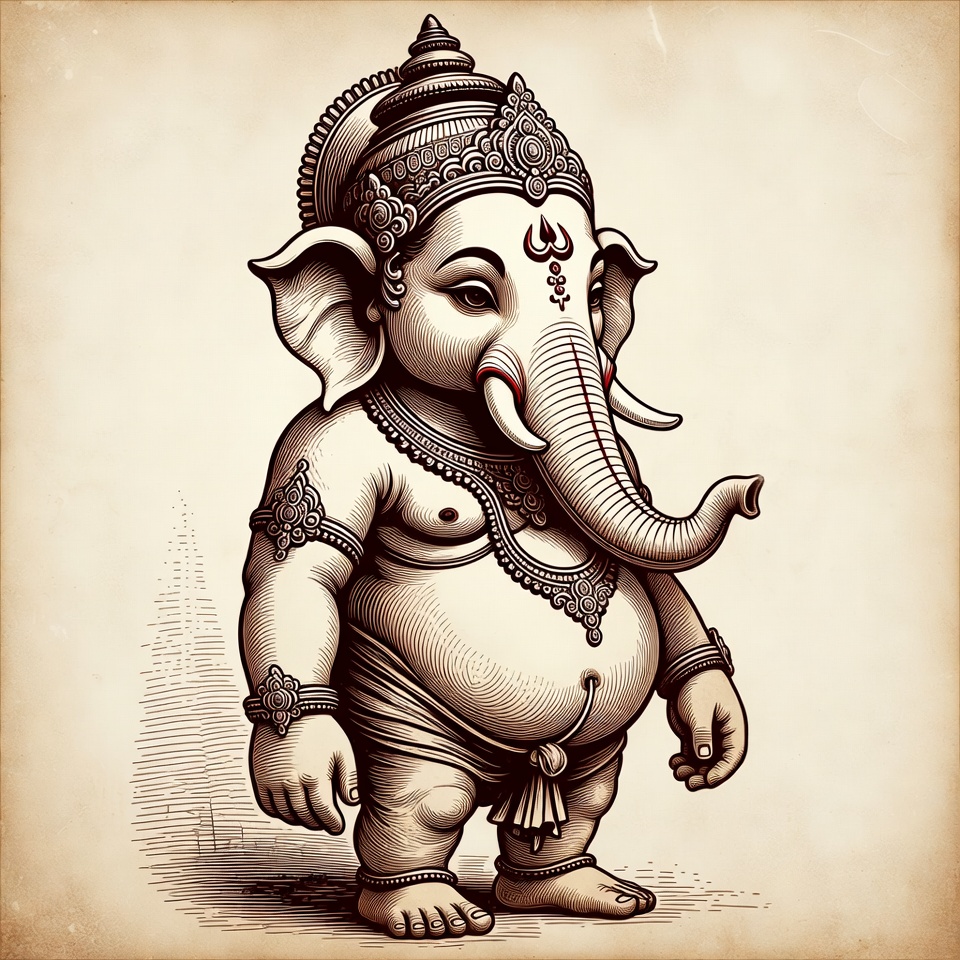 Ganesh, Hindu deity, Indian god, beige background, big ears, chubby elephant, clipart, cute Ganesha, dhoti, drawing, elephant god, illustration, isolated background, jewelry, mythology, ornate crown, religious art, sepia tones, trunk, vintage style, Ganesha