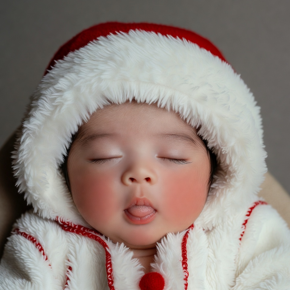 Asian baby, Christmas baby, Santa hat, Santa outfit, closed eyes, cute baby, female baby, gray background, holiday baby, hooded suit, infant, newborn, portrait, red hat, rosy cheeks, sticking tongue, white fur, baby