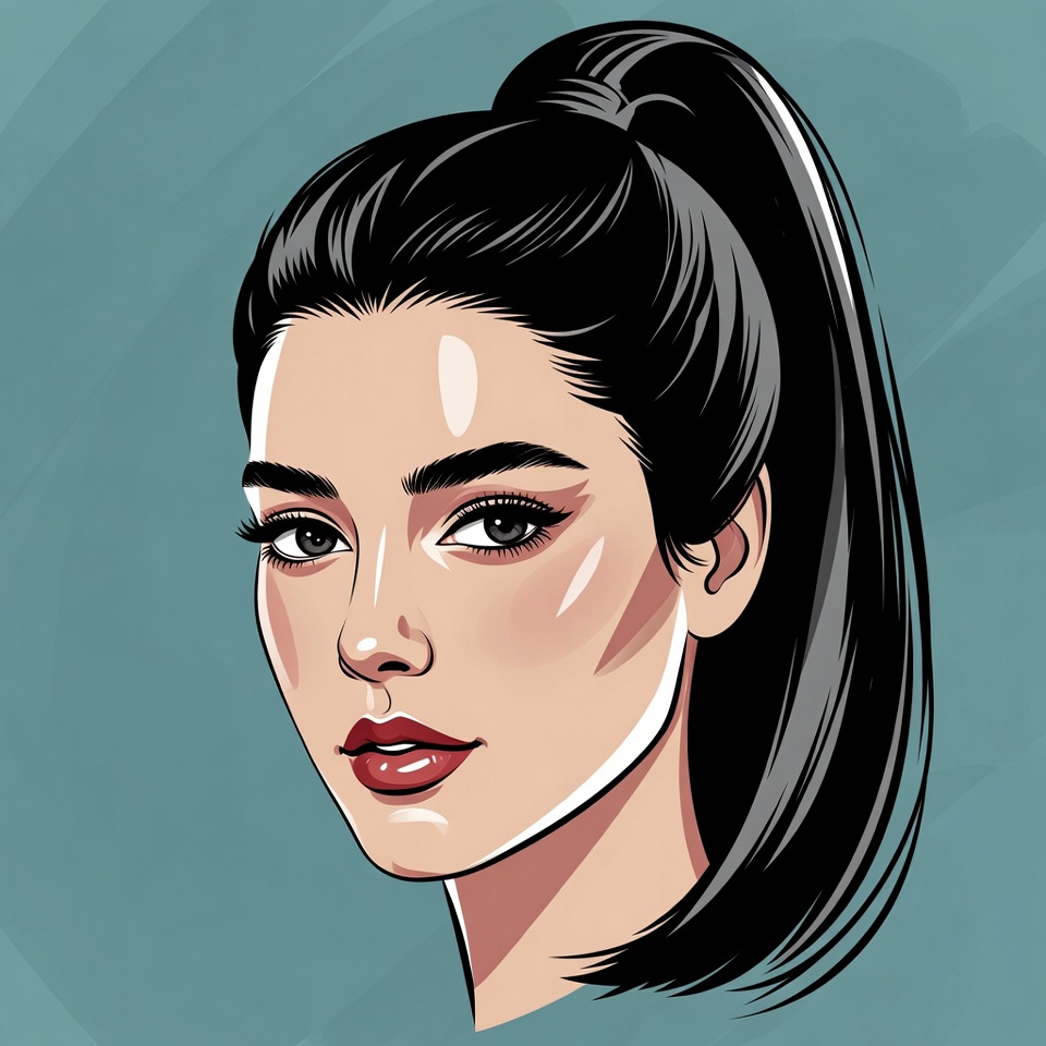 A stylized illustration of a young woman with long black hair in a high ponytail on a teal background. She has bold eyebrows, long eyelashes, glossy pink lips, and subtle cheek highlights. Her face is turned slightly to the side with a direct gaze.