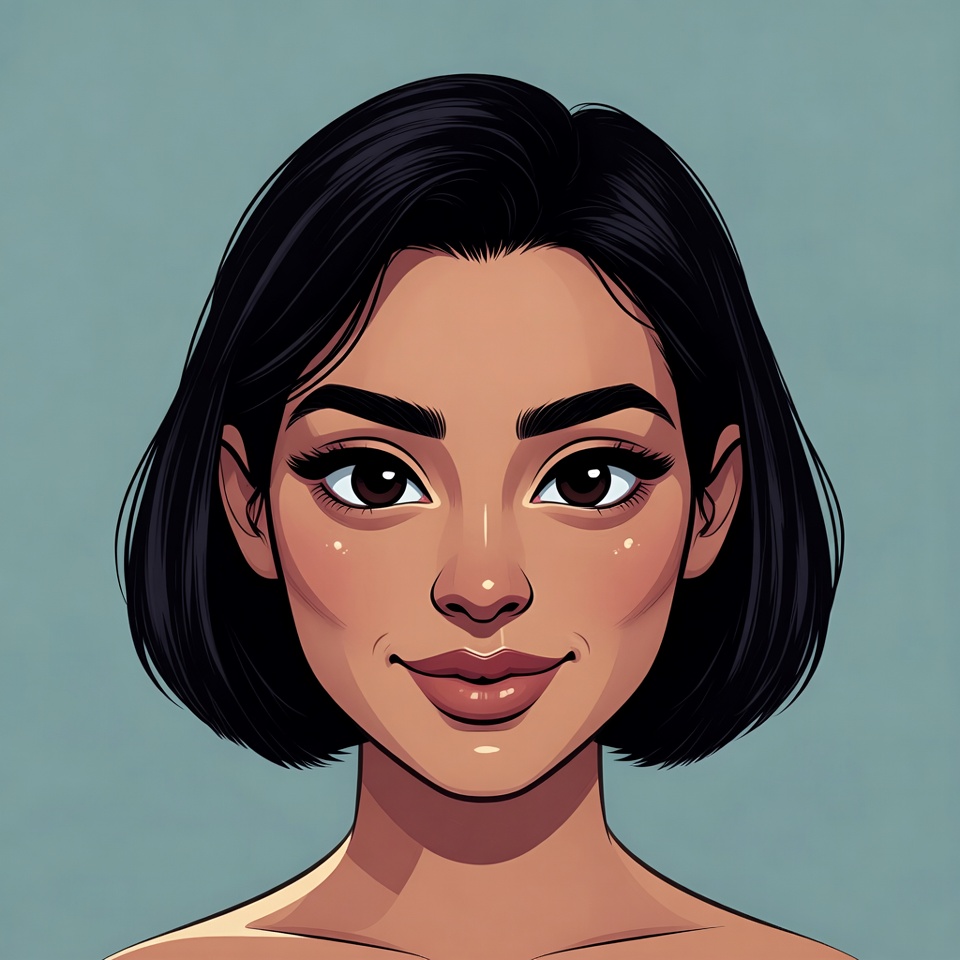Asian, anime inspired, beautiful, black hair, bob haircut, brown eyes, cartoon style, closeup, digital art, earrings absent, expressive eyes, face, female, friendly smile, glossy lips, headshot, illustration, isolated background, makeup, portrait, rosy cheeks, smiling, smooth skin, vibrant, young, woman