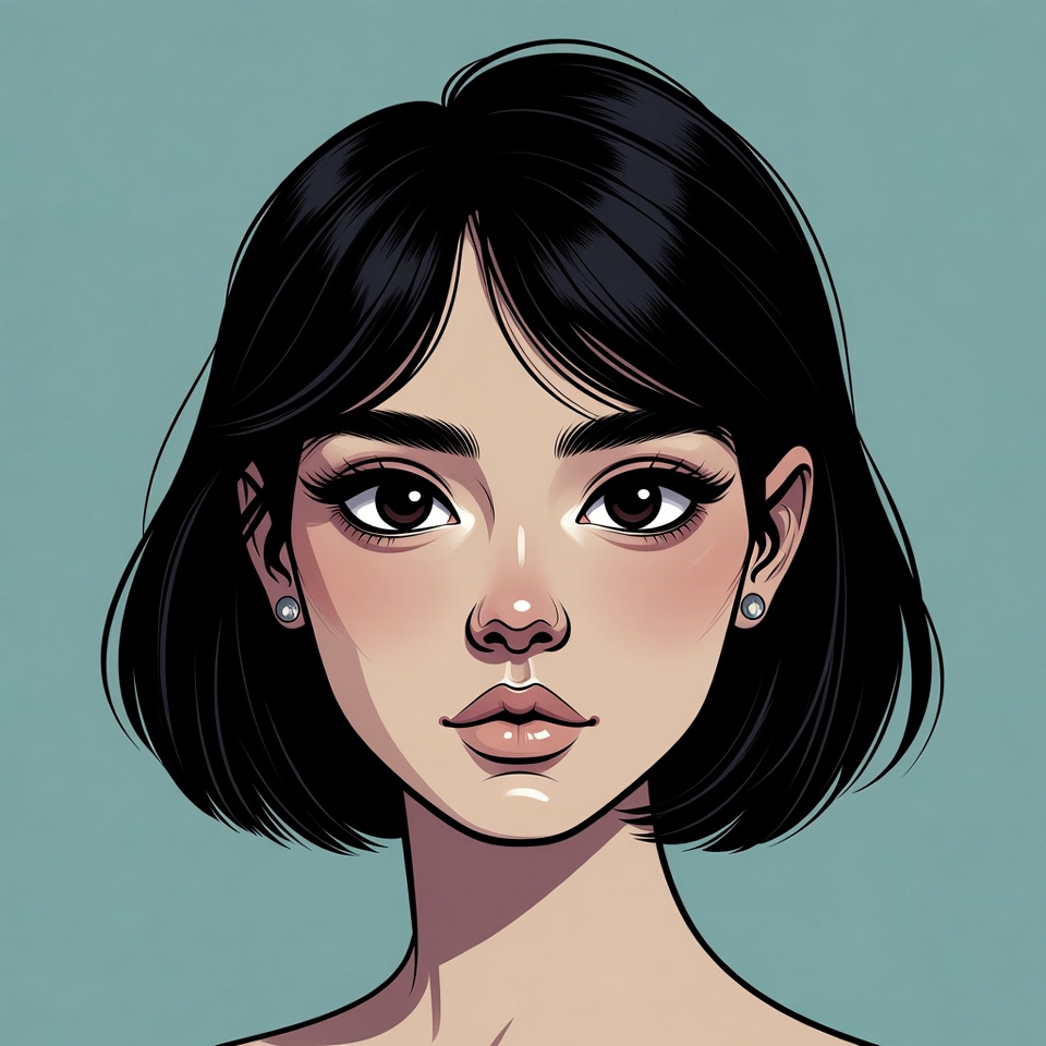 Digital illustration of a young Asian woman with straight black bob haircut and pearl earrings. She has large expressive eyes, glossy lips, and smooth flushed cheeks on a teal background. The portrait features clean line art with soft shading.