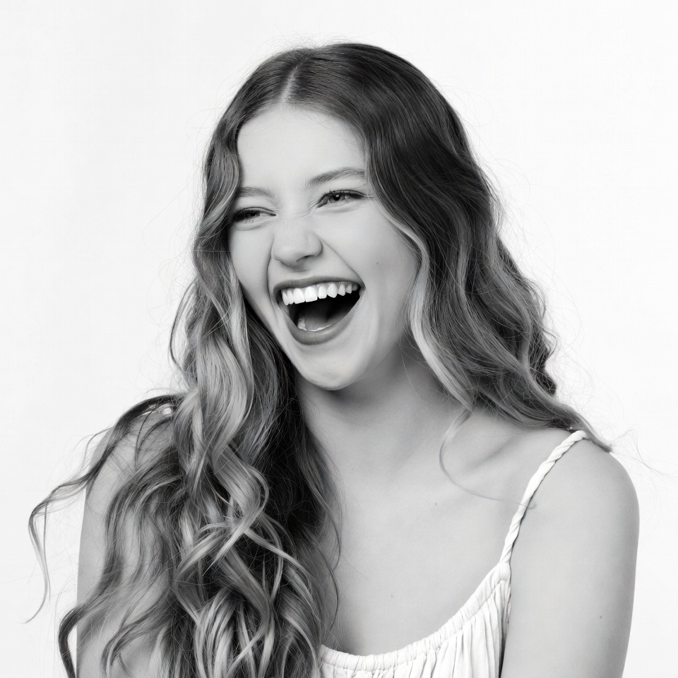 A young woman with long wavy hair smiles widely while laughing in a black and white portrait. She wears a sleeveless top and turns her head slightly to the side. Her eyes are squinted in joy against a plain white background.