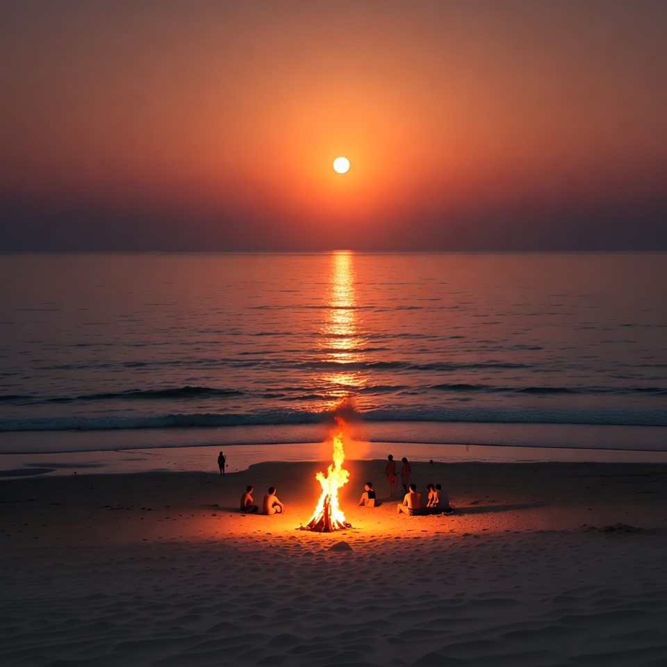 A vibrant bonfire burns on the sandy beach as a small group of people sits around it. The sun sets over the ocean, casting an orange glow and reflecting on the calm water. Gentle waves lap at the shore in the foreground.