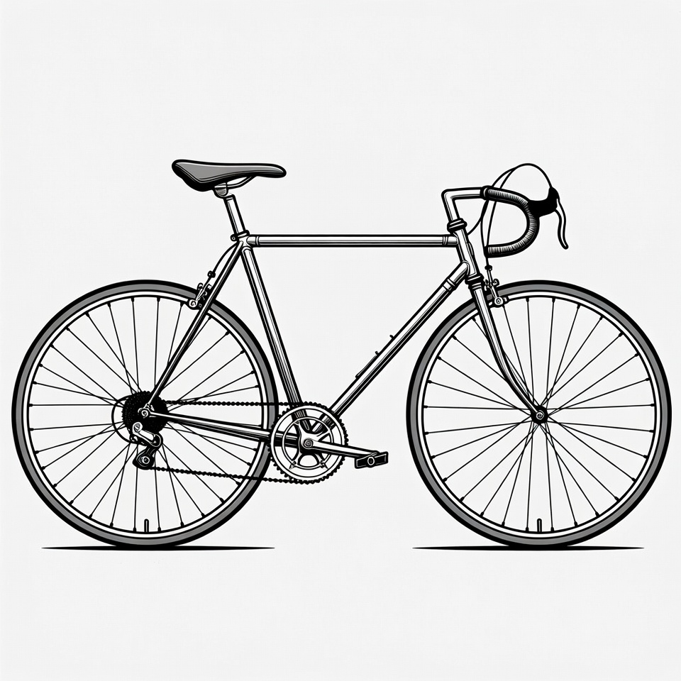 bike frame, black ink, chain, clipart, cycling, drawing, drop handlebars, illustration, isolated background, line art, outline, pedals, racing bike, road bike, saddle, side view, sport bike, vector, wheels, white background, bicycle